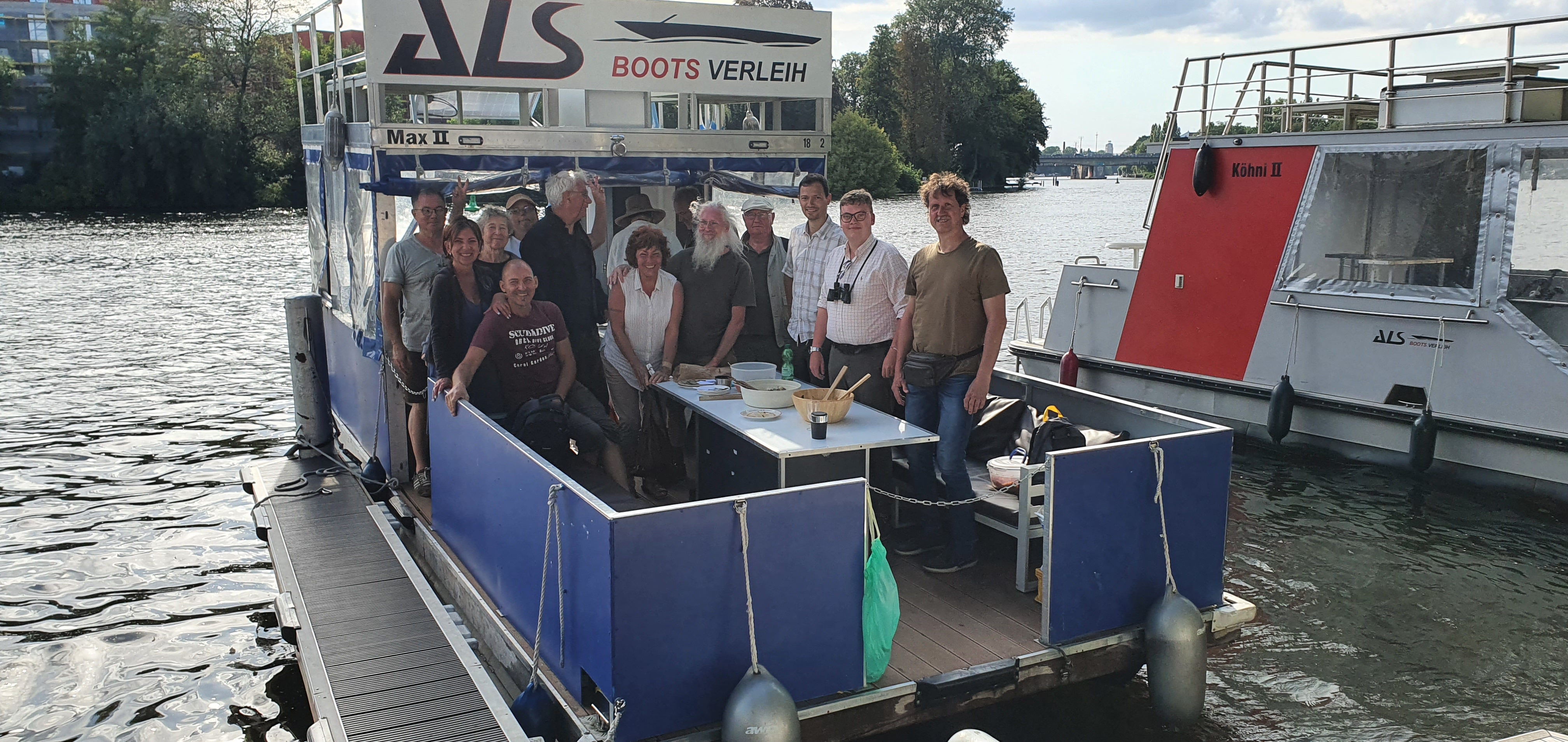 Unser diesjähriges Sommerfest fand am 21.08.2022 auf dem Wasser statt. Kalle Dreher hatte ein Floß organisiert und wir schipperten bei angenehmen Temperaturen und viel Sonnenschein ausgehend von Köpenick den Müggelsee, die Spree und die Dahme hinunter. Hatten manche vielleicht angesichts der Fahrtdauer von 8 Stunden befürchtet, dass Langeweile aufkommen könnte oder die Gespräche mangels Themen versiegen könnten, muss das Gegenteil festgestellt werden. Eine völlig neue Perspektive vom Wasser aus entrückte uns dem Gewohnten, die unterschiedlichsten Panoramen am Ufer und der rege Betrieb von Booten und Schiffen aller Arten ließen Langeweile nicht aufkommen. Selbst ornithologisch wurde mit Kormoranen, Kanadagänsen, Reihern und anderen Wasservögeln einiges geboten. Höhepunkte waren ein Fischadler, der relativ niedrig über uns Ringholte und ein Seeadler, der hoch über uns wegstrich.