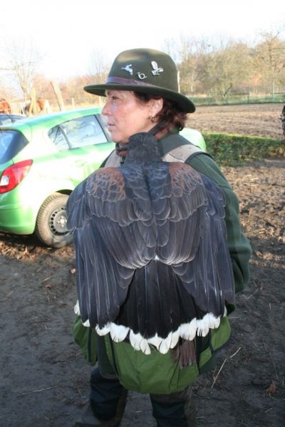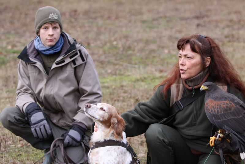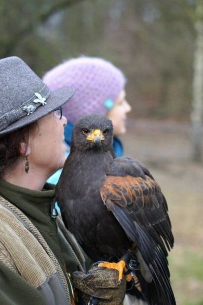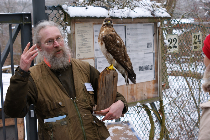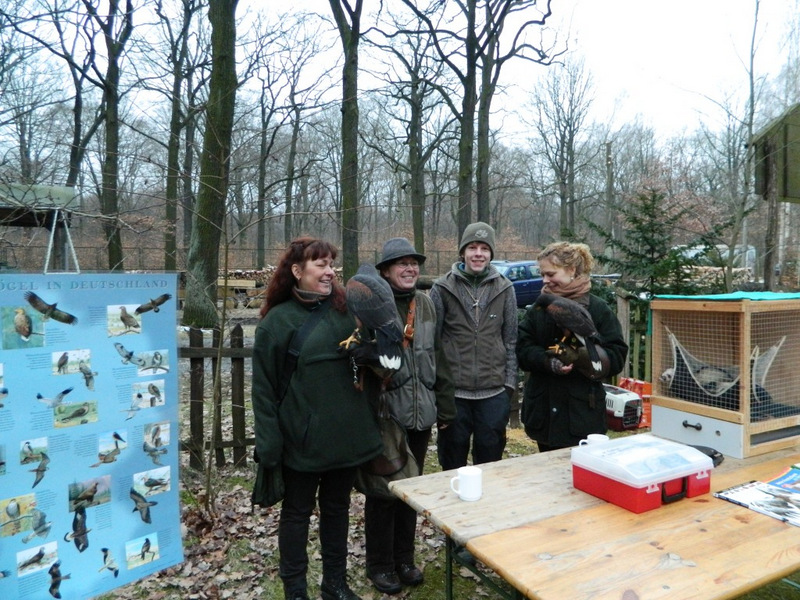 Am 10.02.2013 unterstützten wir Antonius, der eine Führung im Grunewald leitete. Die Veranstaltung trug den Titel „Mit den Augen des Habichts“. Wir trafen uns auf dem Parkplatz am Ökowerk, wo Antonius zunächst mithilfe eines Mäusebussard-Präparates die biologischen Grundlagen der Greifvögel erklärte. Dann wanderten wir gemeinsam mit etwa 25 interessierten Zuschauern – darunter auch einige Kinder - zum Dahlemer Feld. Unterwegs gab es viele Spuren und Zeichen, die Antonius den interessierten Gästen erklärte. Unsere Harris Hawks waren schon fast beim Mausergewicht angekommen, so dass wir sie leider nicht fliegen lassen konnten. Aber wir schlieften ein Frettchen in einen Kaninchenbau ein um den Leuten wenigstens die Vorarbeiten zu einem Jagdflug demonstrieren zu können. Nach einiger Zeit sprang dann auch ein Kaninchen aus dem Bau und lief unbehelligt davon. Einige Zeit später erschien auch das Frettchen wieder und wir konnten den Rückweg antreten. Alle Teilnehmer waren zufrieden und fanden die Veranstaltung sehr gelungen.
