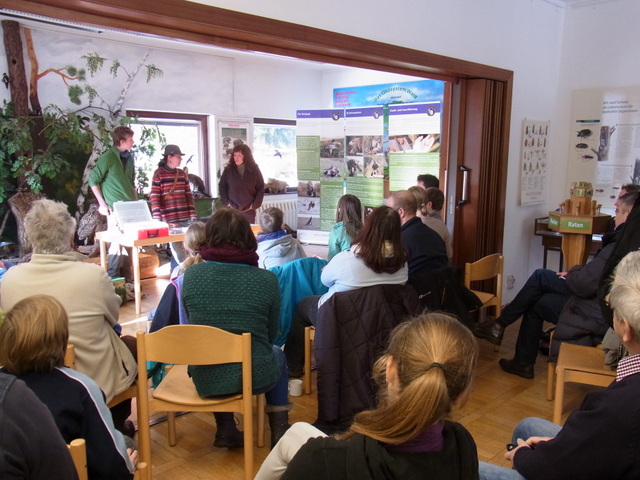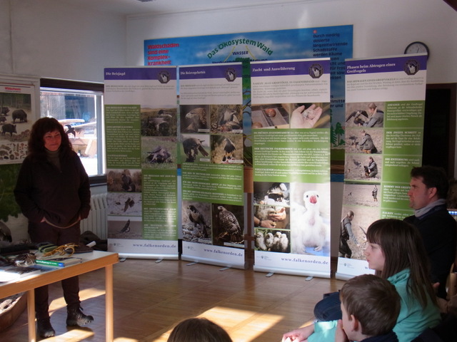 In der mit interssierten großen und kleinen Menschen gut gefüllten Waldschule Teufelssee waren Kathrin, Juri und ich am 26. Januar 2014 zu einer Öffentlichkeitsarbeit angemeldet. Leider konnten wir unsere Tiere bei einer Tageshöchsttemperatur von -10° nicht mitbringen. Aber wir hatten vier unserer Aufsteller mitgebracht sowie etliche Bücher, Flyer, Falknereizubehör, Federn, Frettchenkisten u.v.m. als Anschauungsmaterial dabei. Es war eine schöne Veranstaltung, die, trotz der anfänglichen Enttäuschung über das Fehlen der angekündigten Greifvögel und Frettchen, allen Teilnehmern viele Informationen gab und gut gefallen hat. Im kommenden Herbst werden wir dann mit den Vögeln und Frettchen nocheinmal dort sein.