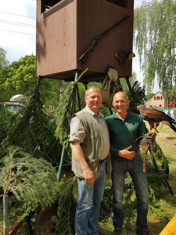 Das große Festjahr anlässlich der ersten urkundlichen Erwähnung Reitweins im Jahre 1316 fand am Sonnabend, den 21.Mai 2016 mit zahlreichen Veranstaltungen seinen Höhepunkt. Als Falkner sind wir regelmäßige Gäste der Reitweiner Jäger und haben auch deshalb gerne die Einladung angenommen und mit Harris und Hund die Jägerschaft in der Öffentlichkeit unterstützt. Das Interesse an der Falknerei war groß, zumal die meisten "Reitweiner" uns bei unseren Beizjagden schon oft aus der Ferne beobachtet haben. Auch ist unsere 1. Oderbruchbeize, die im November 2014 stattgefunden hat, immer noch ein Gesprächsthema im Ort.